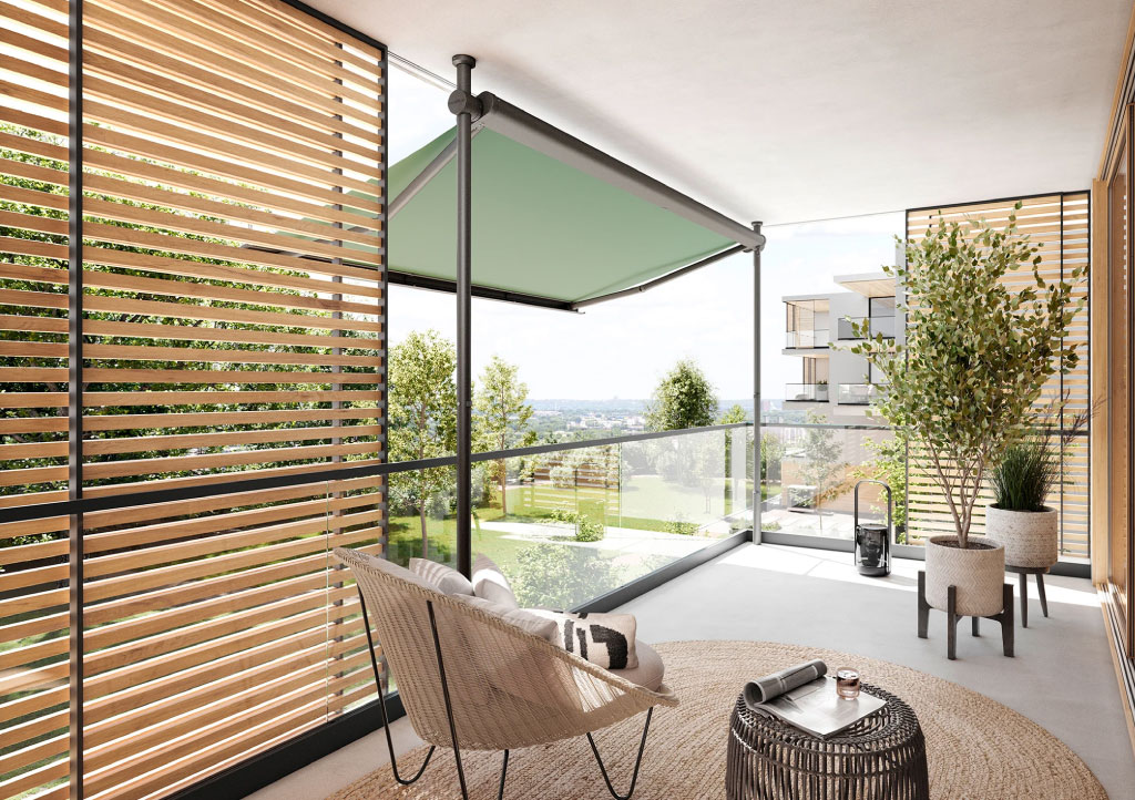 Created for city balconies and compact outdoor spaces, the markilux 900 clamp awning combines slim full cassette styling with high-quality articulated arm technology for effective shade and a clearer outward view. Unlike more traditional balcony awnings with drop arms, its design helps maintain an open feel while still providing excellent solar protection and reducing heat on the balcony and in neighbouring rooms.