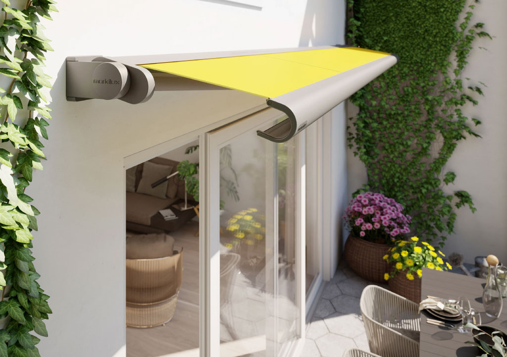 The markilux 900 Fix is a compact full cassette awning designed for balconies, small patios and house walls where discreet, permanent fixing is preferred. With its slim, filigree design and high-quality folding-arm technology, it delivers effective shade, a more comfortable indoor climate and a clean modern look that sits beautifully against the building. Markilux describes it as a compact full cassette awning with discreet fixing to the face, top or rafters, plus full shading with the best view and an individually selectable angle of pitch.